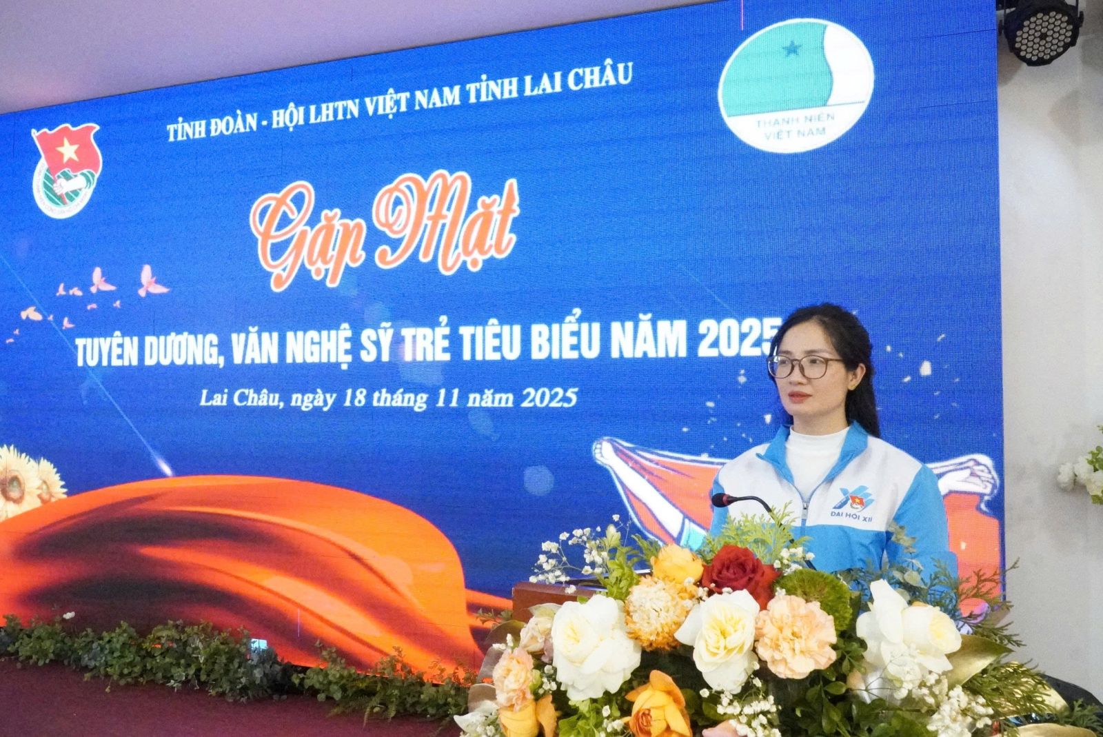 Phát biểu tại buổi gặp mặt, đồng chí Vừ Thị Mai Dinh - Ủy viên BCH Đảng bộ tỉnh, Phó Chủ tịch Ủy ban MTTQ Việt Nam tỉnh, Bí thư Tỉnh đoàn khẳng định: Văn nghệ sĩ trẻ là lực lượng giàu nhiệt huyết, sáng tạo và luôn tiên phong trong việc lan tỏa giá trị văn hóa, giữ gìn bản sắc, đồng thời truyền cảm hứng tích cực đến cộng đồng. Những tác phẩm, công trình nghệ thuật của các bạn trẻ đã góp phần quảng bá hình ảnh con người và quê hương Lai Châu tươi đẹp, hiếu khách đến bạn bè trong nước và quốc tế.
